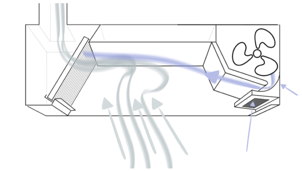 - Es wird die in die Erfassungshaube einströmende Raumluft über eine spezielle Ansaugung erfasst und beschleunigt über eine Induktionsströmung Richtung Abscheider transportiert.